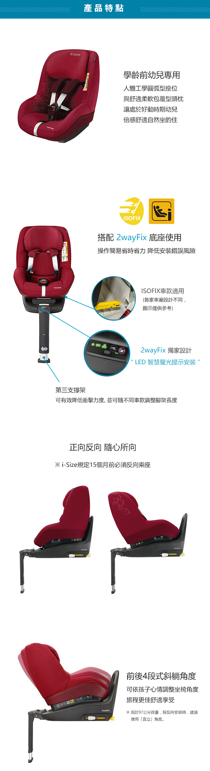 全新iSize規格,與「FamilyFix One iSize底座 (2wayFix)」搭配使用,提供幼兒前/後向選擇和多躺度調整,提供6個月-4歲幼兒更安全舒適的乘座感受。