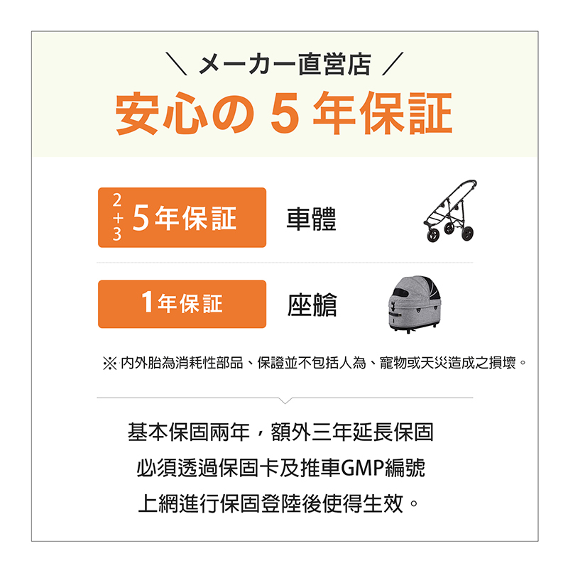 ※ 保固No1:保固2+3五年保固;台灣服務,冠絕全台寵物、婦幼車界